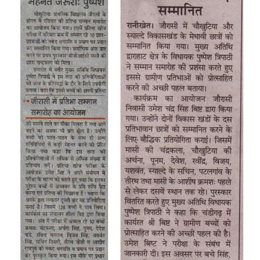 Based on the performance of students in the written exam, top 10 students were selected and presented with certificates and cash prizes in a prize distribution function organized on 28.12.2008 at Jaurasi, my hometown, a place at the centre of these two blocks Chaukhutia & Syalde.