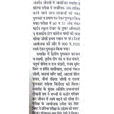 Based on the performance of students in the written exam, top 10 students from Govt. schools and top 5 students from Private schools were selected and presented with certificates and cash prizes in a prize distribution function organized on 28.12.2018 at Jaurasi, my hometown, a place at the centre of these two blocks Chaukhutia & Syalde.