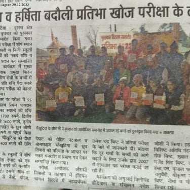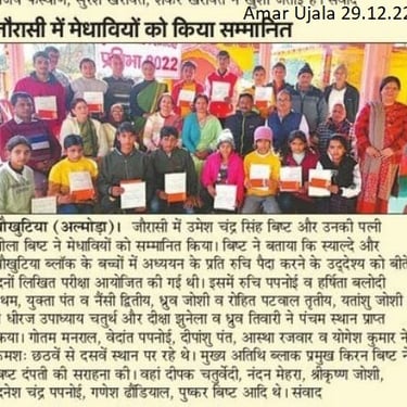 This test for the students of 9th & 10th standard of 57 schools (50 Govt Schools & 7 Private schools) of Chaukhutia & Syalde Block, District Almora, Uttarakhand was conducted on 25.12.2022 at 2 examination centres namely Saraswati Vidya Mandir Chaukhutia and GIC Syalde. Total 245 students participated in the written test.