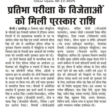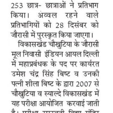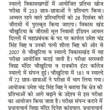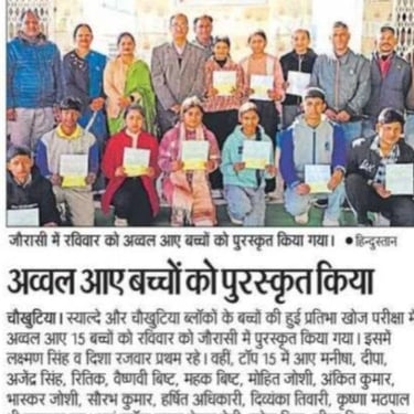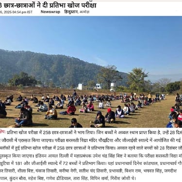 This test for the students of 9th & 10th standard of 57 schools (50 Govt Schools & 7 Private schools) of Chaukhutia & Syalde Block, District Almora, Uttarakhand was conducted on 25.12.2025 at 2 examination centres namely Saraswati Vidya Mandir Chaukhutia and GIC Syalde. Total 253 students participated in the written test.