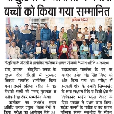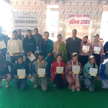 Based on the performance of students in the written exam, top 10 students from 50 Govt. schools and top 5 students from 7 Private schools were selected and presented with certificates and cash prizes in a prize distribution function organized on 28.12.2025 at Jaurasi, my hometown, a place at the centre of these two blocks Chaukhutia & Syalde.