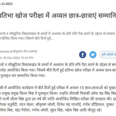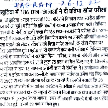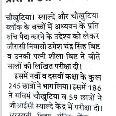 This test for the students of 9th & 10th standard of 57 schools (50 Govt Schools & 7 Private schools) of Chaukhutia & Syalde Block, District Almora, Uttarakhand was conducted on 25.12.2022 at 2 examination centres namely Saraswati Vidya Mandir Chaukhutia and GIC Syalde. Total 245 students participated in the written test.
